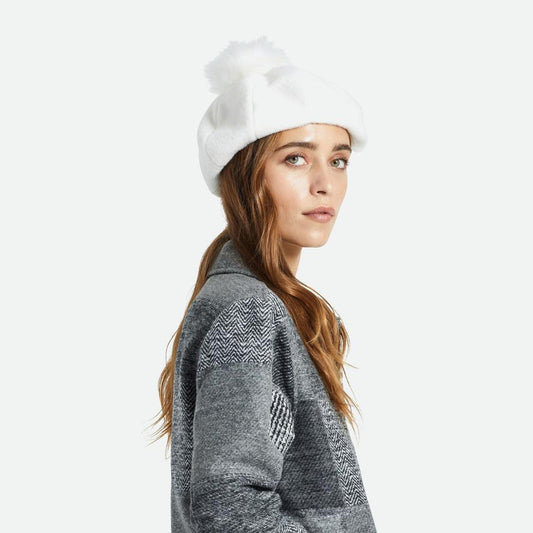 Brixton Natalie Oversized Kunstfell Bommel Baskenmütze - Cremeweiß