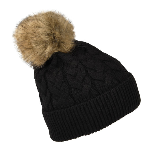 Joules Elena Cable Knit und Kunstfell Bommel Bommelmütze - Schwarz