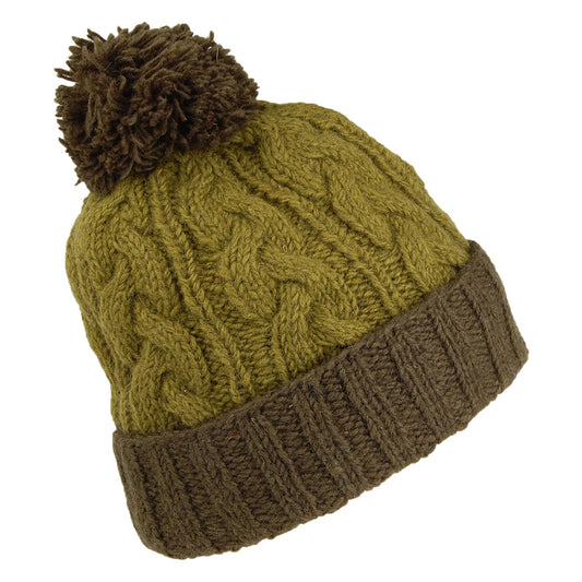 Kusan 2-Tone Turn Up Bommelmütze mit Zopfstrickmuster - Olivgrün-Grün