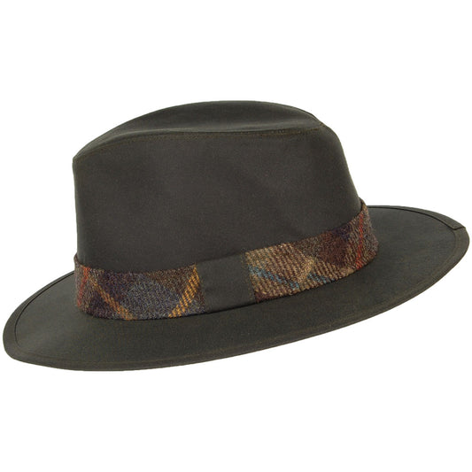 Failsworth Drifter Fedora Hut mit Karo-Zierstreifen aus gewachster Baumwolle - Olivgrün