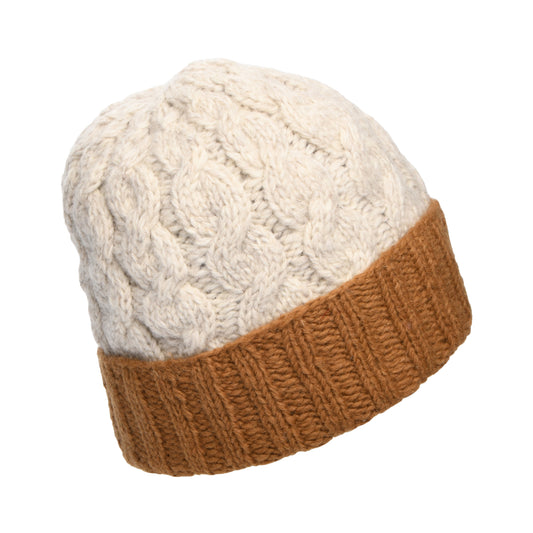Kusan 2-Tone Turn Up Beanie Mütze mit Zopfstrickmuster - Cremefarben-Toffee