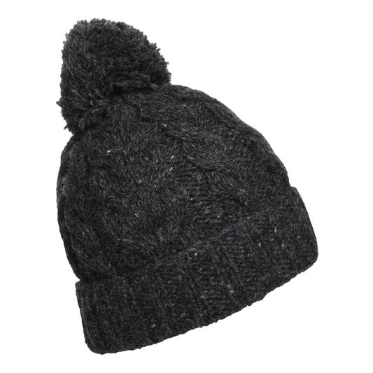 Kusan Turn Up Bommelmütze mit Zopfstrickmuster - Anthrazit