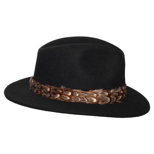Denton Kansas Knautschbarer Wasserabweisende Fedora Hut aus Wollfilz mit Feder-Hutband - Schwarz