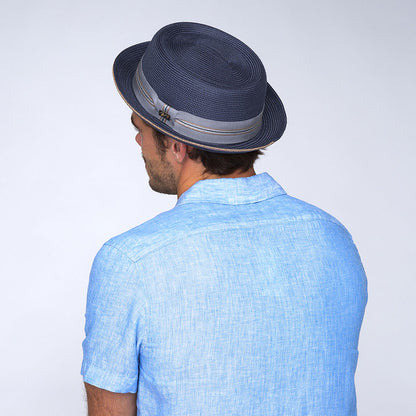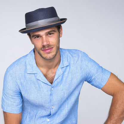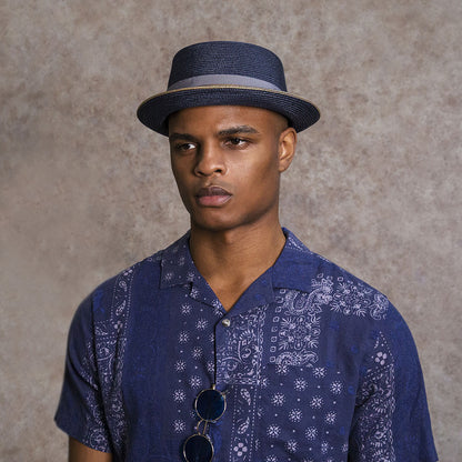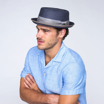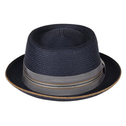 Hier ist der Bailey Hats Carver Pork Pie Hut in marineblau. Dieser schöne Sommer Carver ist ungefüttert für Atmungsaktivität und kommt mit einem Baumwoll-Schweißband für Komfort. Der Hut ist mit einem gestreiften Hutband und einem Bailey-Abzeichen an der Seite verziert.