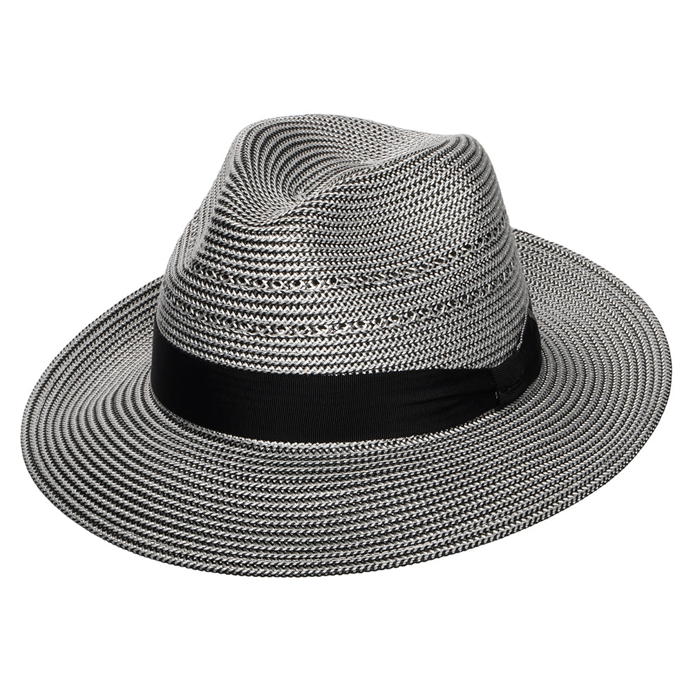 Der Bailey Eli Fedora Hut in schwarz-mix verfügt über eine einzigartige zweifarbige geflochtene Konstruktion mit einem Ripsband-Hutband mit einem kontrastierenden Akzent und einem Bailey-Abzeichen an der Seite. Die ungefütterte Mütze ist mit einem Baumwollschweißband für zusätzlichen Komfort ausgestattet.