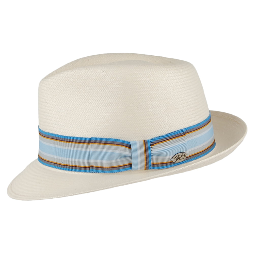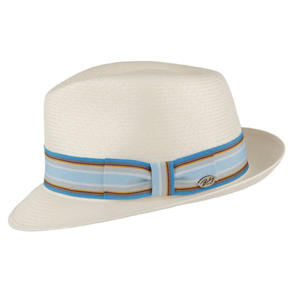 Hier ist der Thrap Teardrop Trilby Hut in natur von Bailey. Er hat ein einzigartiges, gestreiftes Hutband in verschiedenen blauen Tönen mit einem Bailey-Logo an der Seite. In dem Hut ist ein Schweißband für zusätzlichen Komfort.