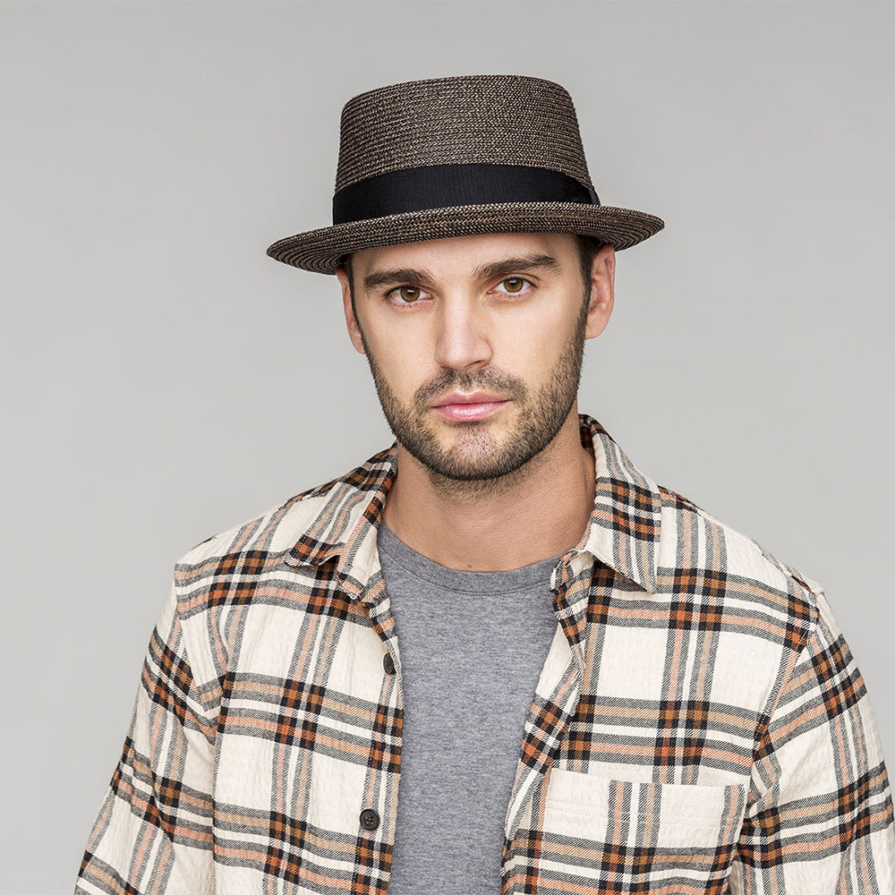 Hier ist der sehr stilvolle Waits Pork Pie Hut von Bailey in braun. Das perfekte kleine Accessoire für den Sommer. Dieser Hut bietet alle Aspekte des Pork Pie Hutes mit einem sehr breiten schwarzen Hutband und einem Bailey-Logo auf dem Knoten auf der linken Seite. Um ein weiches Gefühl zu gewährleisten, finden Sie ein gepolstertes Schweißband.
