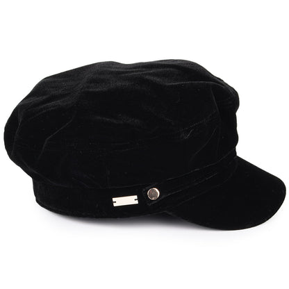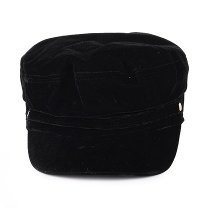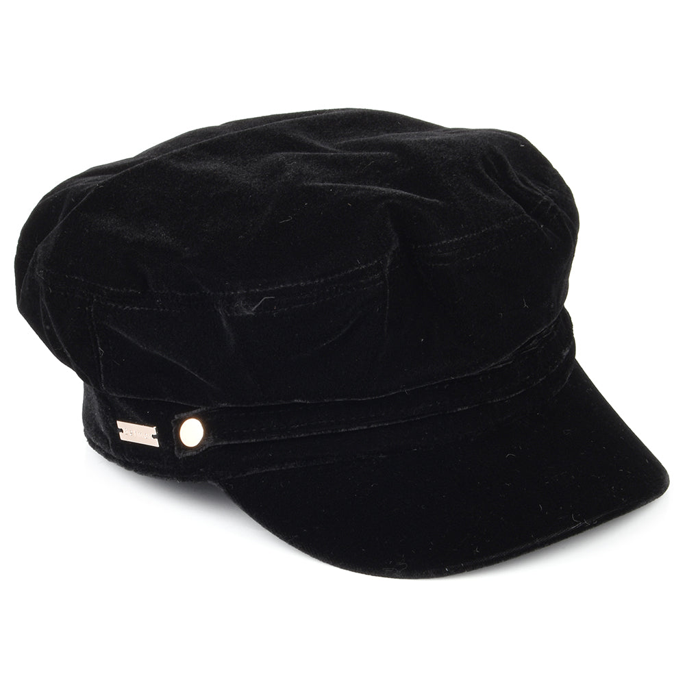 Die Betmar Odile Schiffermütze in schwarz besteht aus einem weichen Samt. Die Innenseite ist mit Baumwolle gefüttert und kommt mit einem verstellbaren Schweißband für eine perfekte Passform. Die Kappe verfügt über ein Zierband auf der Vorderseite und ein Betmar-Abzeichen an der Seite genäht.