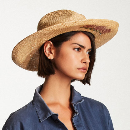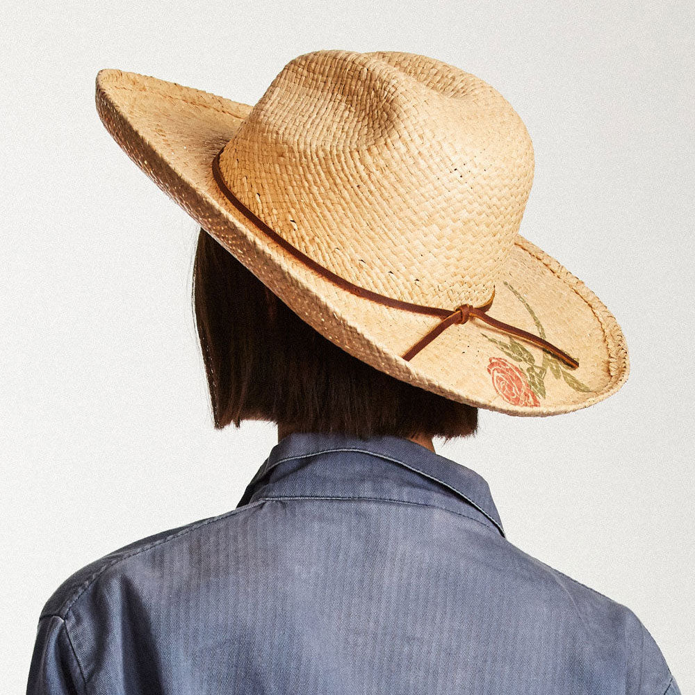 Hier ist der Brixton Jenna Fedora Sonnenhut in Natur. Dieser Hut mit breiter Krempe hat ein Lederhutband und ein einzigartiges Rosenmuster sowohl auf der Rückseite der Krempe als auch auf der Vorderseite der unteren Seite der Krempe. Der Hut besteht aus 100% Baststroh und ist ungefüttert.