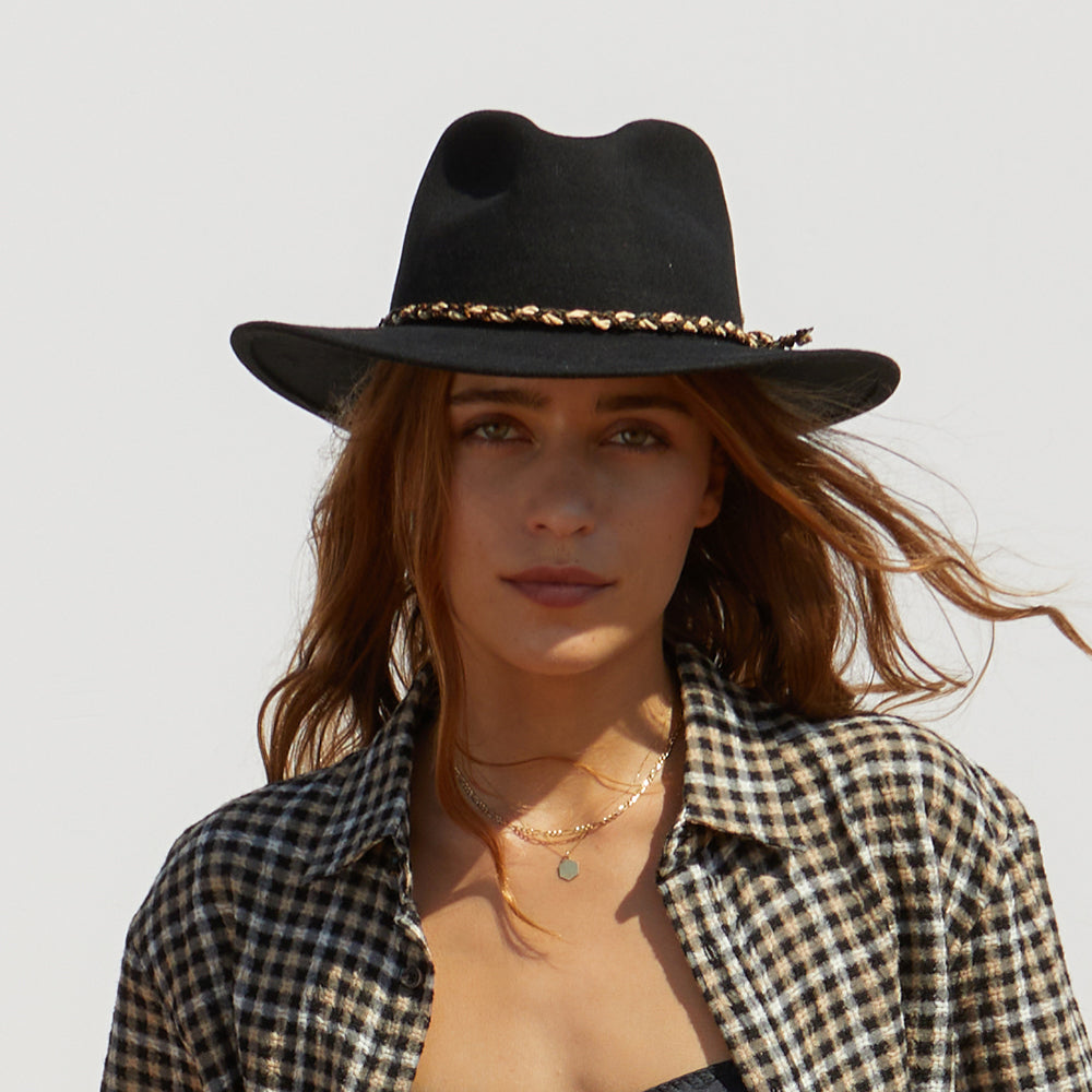 Dieser schwarze Fedora kombiniert den klassischen Stil der Messer-Silhouette mit einer etwas größeren Krempe für eine westliche Ästhetik. Mit einem geflochtenen Hutband und einer Brixton-Nadel an der Seite ist dieser Hut ungefüttert und steifer als der Original Messer. Das Baumwollschweißband wird mit einem verstellbaren Klettverschluss für eine perfekte Passform geliefert. Die Wolle, die für diesen Hut verwendet wird, ist von der RWS zertifiziert, einem freiwilligen Standard, der das Wohlergehen von Schafen und das Land, auf dem sie grasen, betrifft.