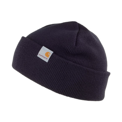 Die Stratus Short Watch Beanie in dunkles marineblau von Carhartt WIP ist eine hochwertige Mütze mit einem aufgerollten Umschlag. Das legendäre Carhartt WIP Logo ist auf der Vorderseite des Umschlags aufgestickt.