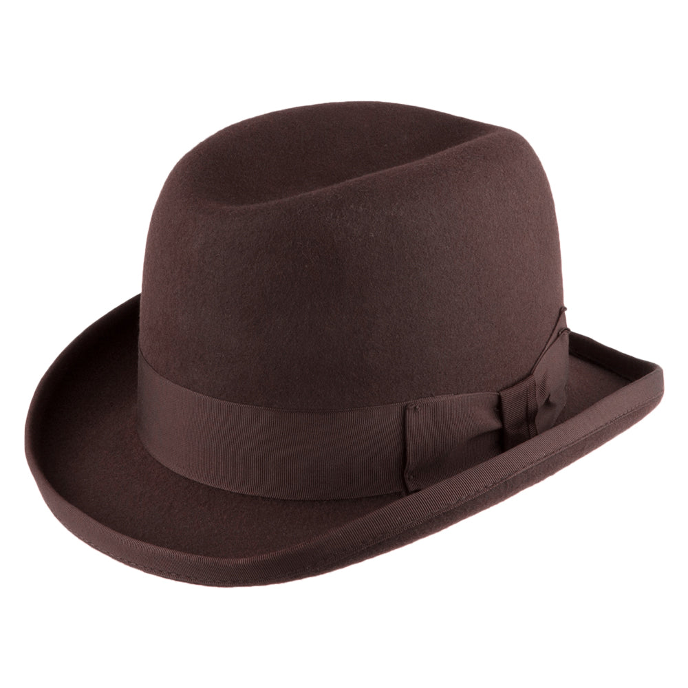 Dies ist der Churchill Homburg von Denton in dunkelbraun. Der Hut ist aus 100% Wollfilz. In der Innenseite befindet sich ein Satinfutter und ein Schweißband aus Leder für optimalen Tragekomfort. Den Hut ziert ein Hutband aus Ripsband und die Krempe ist ebenfalls in Ripsband eingefasst. Die Krone dieses Huts ist ca. 12.5 cm hoch und die Krempe ca. 4 cm breit.