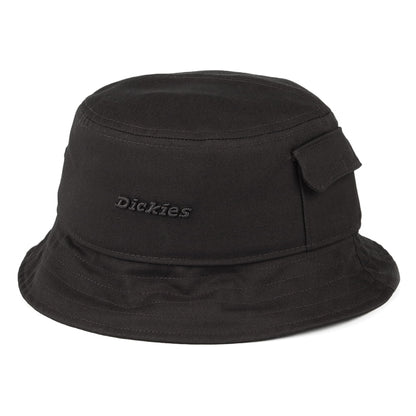 Dies ist der Dickies Bogalusa Fischerhut in schwarz. Der Hut hat den Namen Dickies auf der Vorderseite gestickt. Er hat dazu eine kleine Tasche auf der linken Seite mit einem Dickies Logo an der Naht genäht.