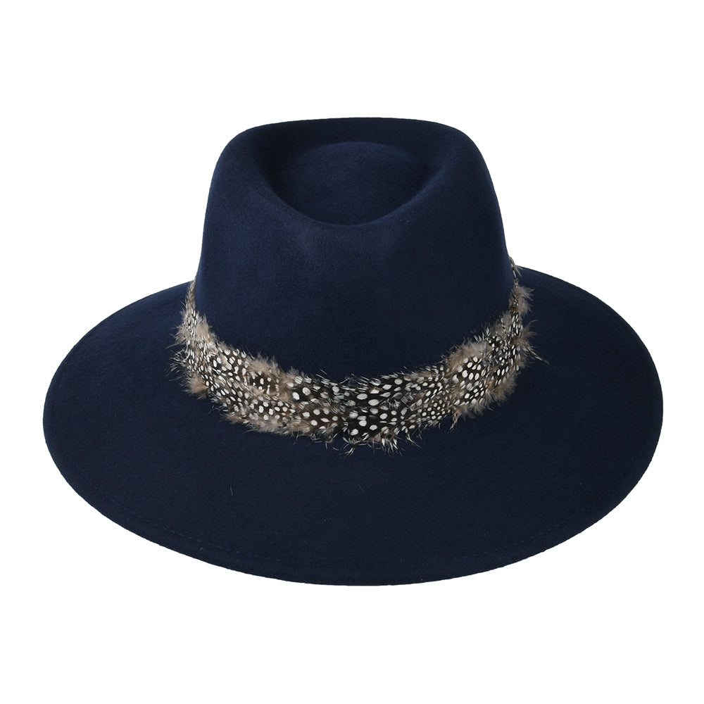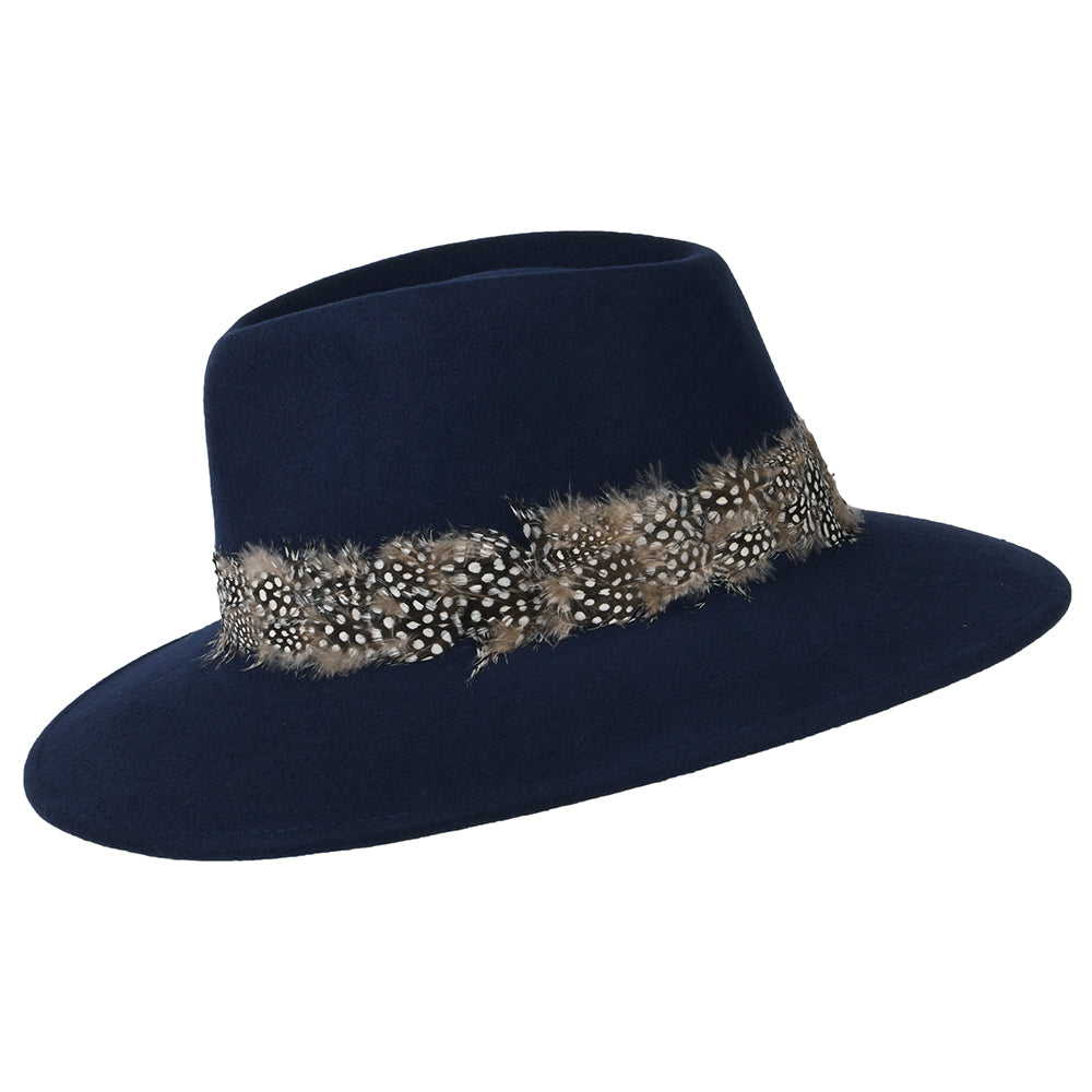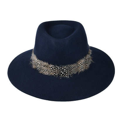 Hier ist der Failsworth Country Feder Fedora Hut in marineblau. Hergestellt aus 100% Wolle, wurde der Hut auf der Außenseite beschichtet, um wasserabweisend und fleckenabweisend zu sein. Ungefüttert hat der Hut ein verstellbares Schweißband für Komfort und eine perfekte Passform. Dieser Hut ist mit einem fantastischen Hutband aus Federn geschmückt. Die Krempe ist ca. 6,5cm breit und die Krone misst ca. 11cm hoch. Ein schöner Hut für die Saison.