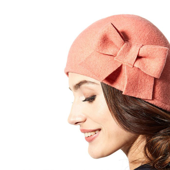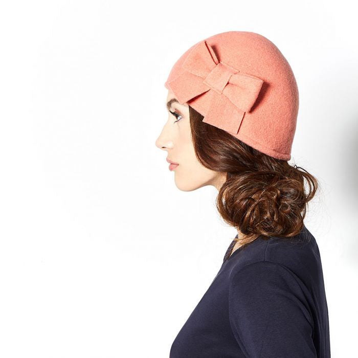 Dies ist der Seine Glockenhut aus 100% Merinowolle von Laulhère in koralle. Diese Mütze ist elegant, bequem und warm. Die rechte Seite ziert eine hübsche Schleife und auf der linken Seite befindet sich eine Laulhère-Anstecknadel.