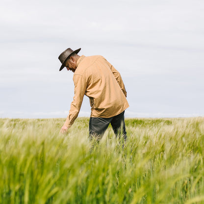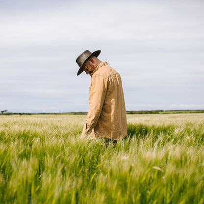 Dieser ungefütterte Hut ist vollständig knautschbar und hat eine 10 cm hohe Krone und eine 7,5 cm breite Krempe. Für zusätzliche Atmungsaktivität wurden auf jeder Seite der Krone zwei Ösen angebracht. Der Hut ist mit einem geflochtenen Hutband aus Leder und einem Jaxon & James-Seitenpin versehen.