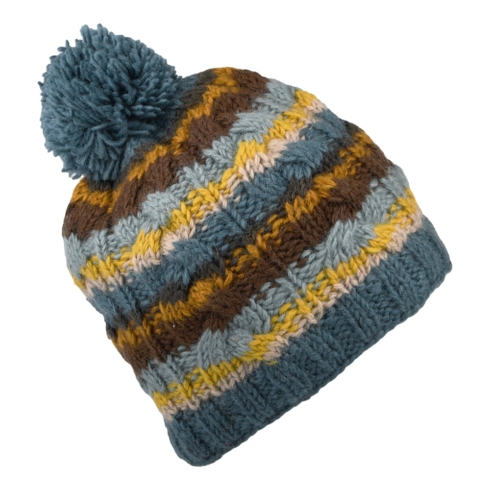 Die Cable Knit Bommelmütze in blau-multi von Kusan ist ein fantastischer, handgefertigter Hingucker aus den Bergen Nepals. Hergestellt aus wunderbar warmer Wolle, hat die Mütze ein gestreiftes Zopfmuster und ist mit einem Kusan Lederanhänger an der Seite versehen. Die Innenseite des Hutes verfügt über ein Fleece-Futter, das aus recycelten Plastikflaschen besteht.