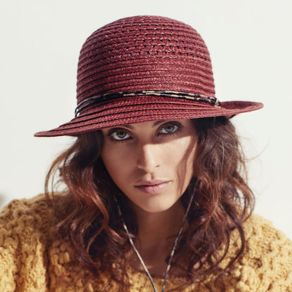 Hier ist der Seeberger Braid Mix Glockenhut in burgunderrot. Dieser elegante Sommerhut aus Papierstroh ist mit einem Seeberger Logo an der Seite und einem verstellbaren Kinnband mit goldenen Details versehen. Der Hut ist ungefüttert und kommt mit einem elastischen Schweißband für eine perfekte Passform. Dieser Hut wird Ihr perfekter Reisebegleiter sein, da er auch faltbar und rollbar ist.