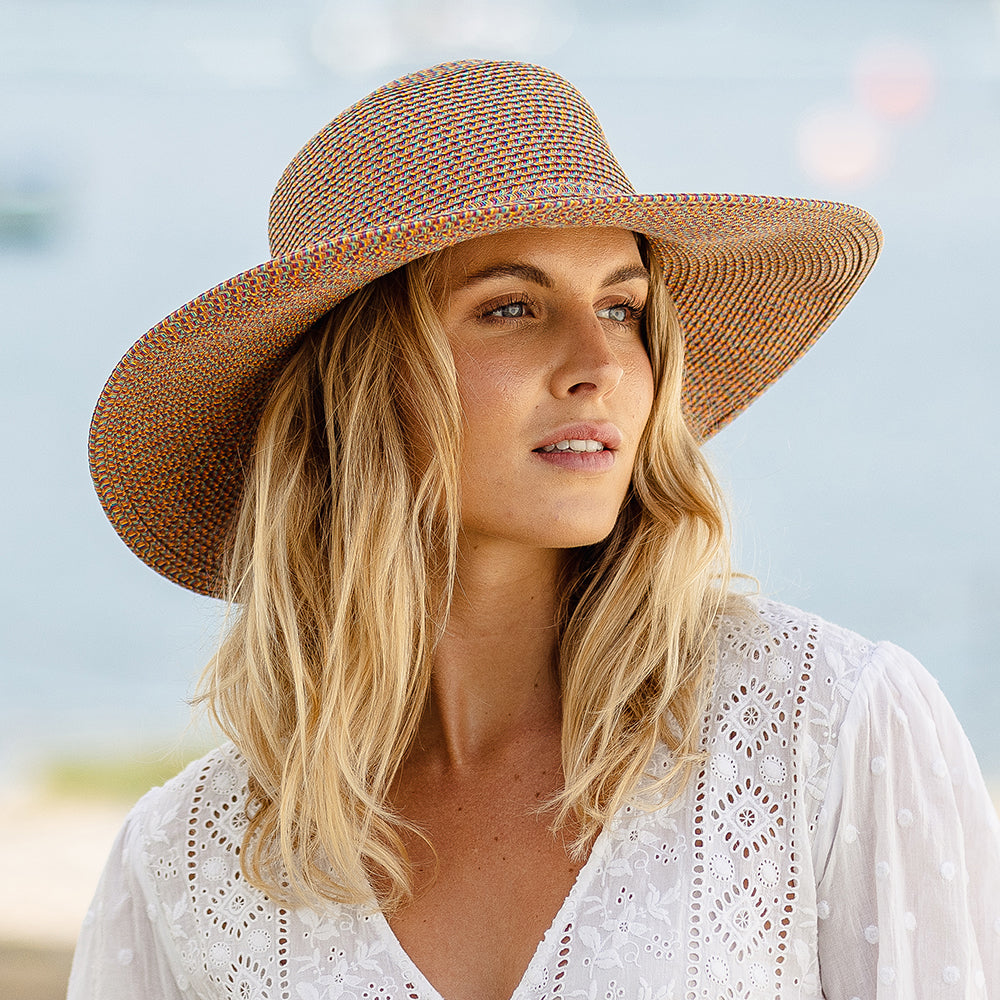 Dies ist der mehrfarbige Sonnenhut Sorbet von sur la tête. Dieser Hut ist der perfekte Sonnenschutz - durch die 10 cm breite Krempe sind Sie immer vor der Sonne geschützt. Auf Grund der Vielfalt der Farben passt er zu allem in Ihrer Sommergarderobe!
