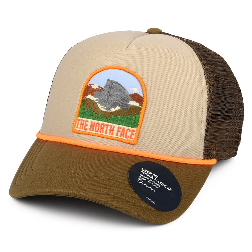 Die North Face Valley Trucker Cap in olivgrün-beige hat eine gepolsterte Front- und Polyester-Netzrückseite. Ein North Face Valley Patch ist auf der Vorderseite bestickt und die Basis der Krone ist mit einem Band verziert. Neben dem verstellbaren Riemen auf der Rückseite befindet sich ein North Face Logo.
