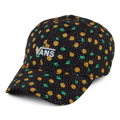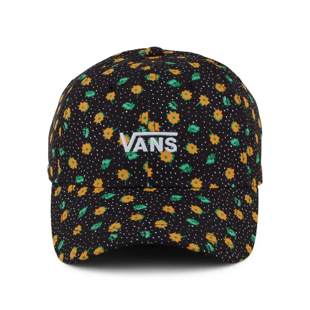 Dies ist die Vans Court Side Polka Ditsy Baseball Cap in schwarz-orange. Die Cap zeigt ein Blumenmuster gemischt mit Polka Punkten. Das Vans-Logo ist auf der Vorderseite bestickt und es gibt einen verstellbaren Riemen auf der Rückseite des Hutes für eine gute Passform.