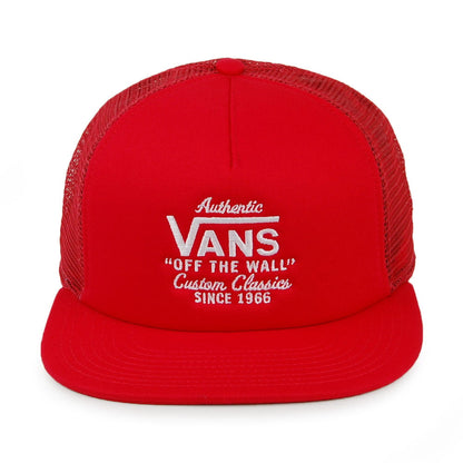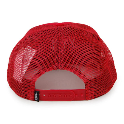 Das ist die Galer Trucker Cap in rot von Vans. Das Material besteht aus 100% Baumwolle und die Rückseite aus Netzstoff. Sie trägt das "off the wall" Logo auf der Vorderseite aufgestickt dazu ein weiteres kleines Logo auf der Rückseite der Cap. Ein größenverstellbarer Riemen am Hinterkopf sorgt für einen perfekten Sitz.